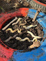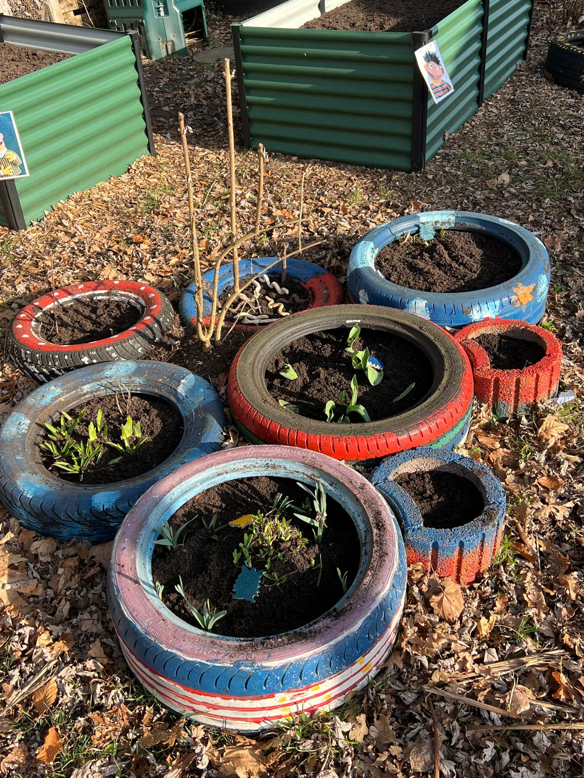 Pünktlich zum Frühlingsanfang startete die erste Gruppe am 17. März und hatte bestes Wetter zum Saisonstart im Nützener Schulgarten! Kinder der EB säubern zuerst die Reifenbeete, dann werden Frühblüher umgetopft.
