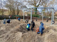 Die Klasse 3/4b gestaltet derzeit den Sandschulhof um: Das Wetter spielt endlich wieder mit, Kubikmeter Sand werden umverteilt.
