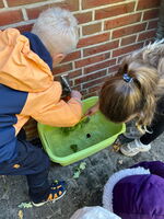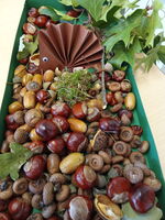 Wir sammeln Naturmaterial für Dekorationen. Die EB bastelt Igel.