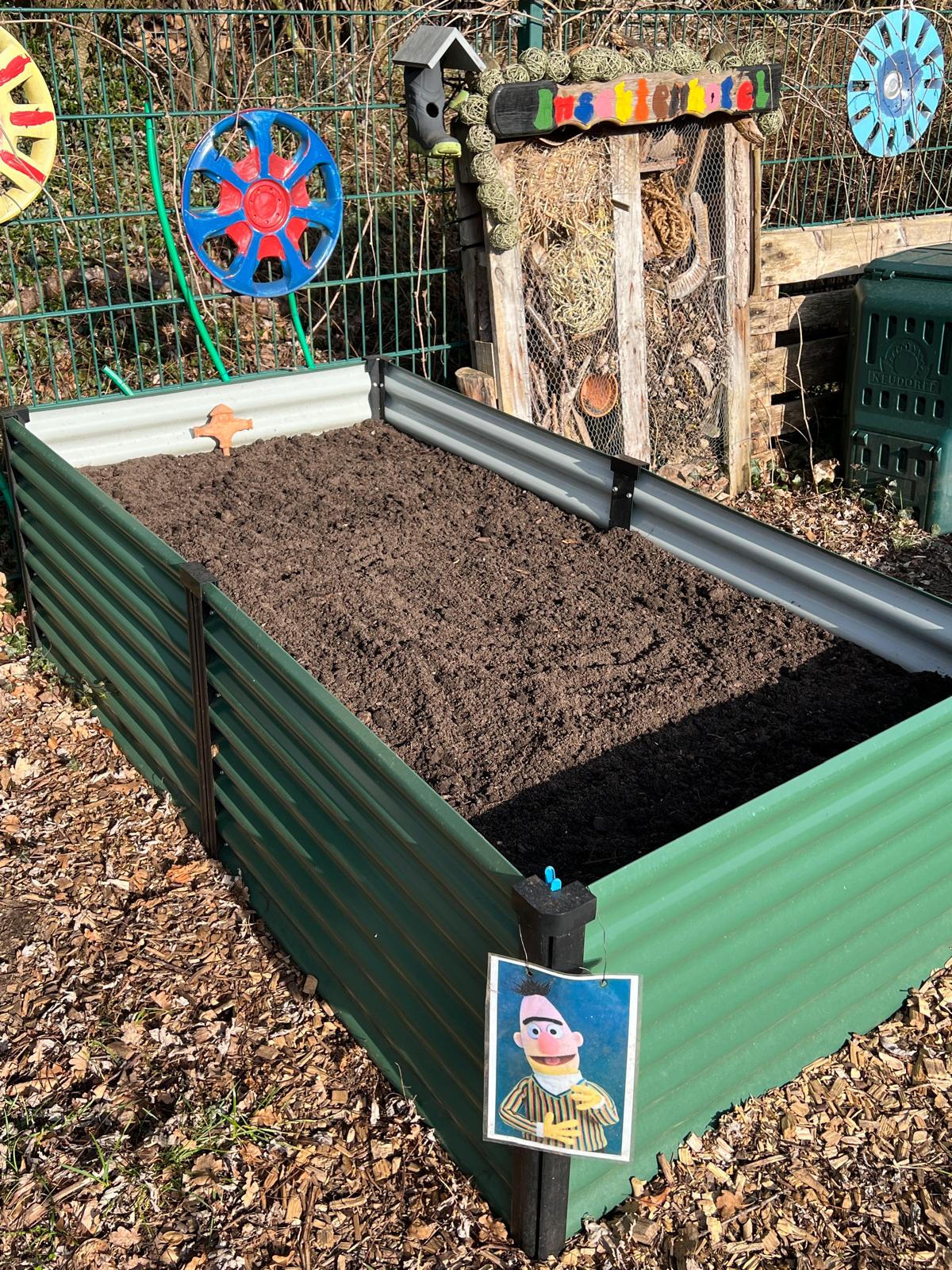 Der Schulgarten in Nützen ist startklar für die neue Saison. Frau Dalldorf hat alles gesäubert und vorbereitet für die neue Aussaat.